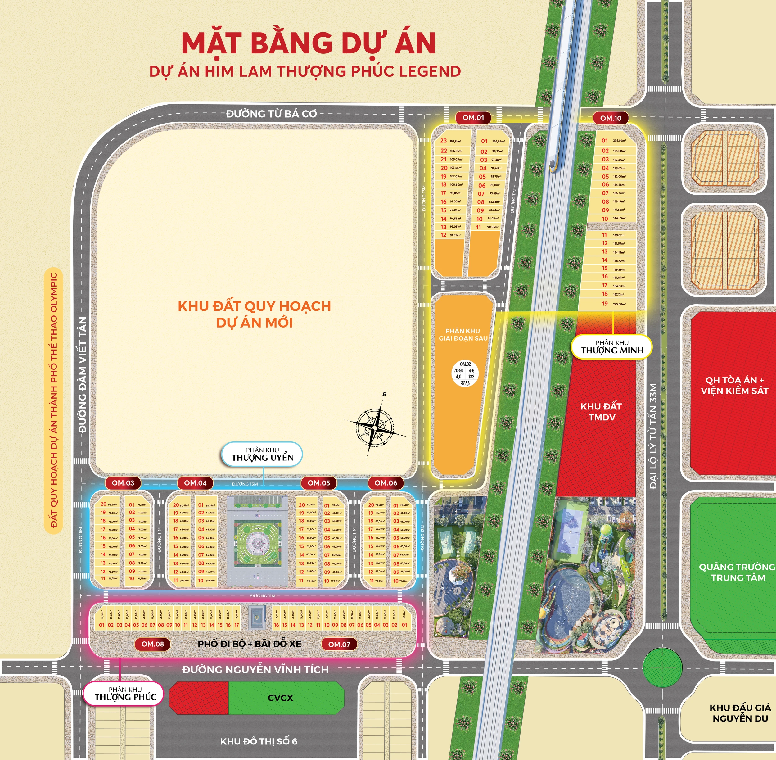 Phân khu Thượng Minh: Nằm phía Đông, tiếp giáp Đại lộ Lý Tử Tấn (33m), tích hợp khu đất Thương mại Dịch vụ (TMDV) quy mô lớn, tiềm năng sinh lời cao.
