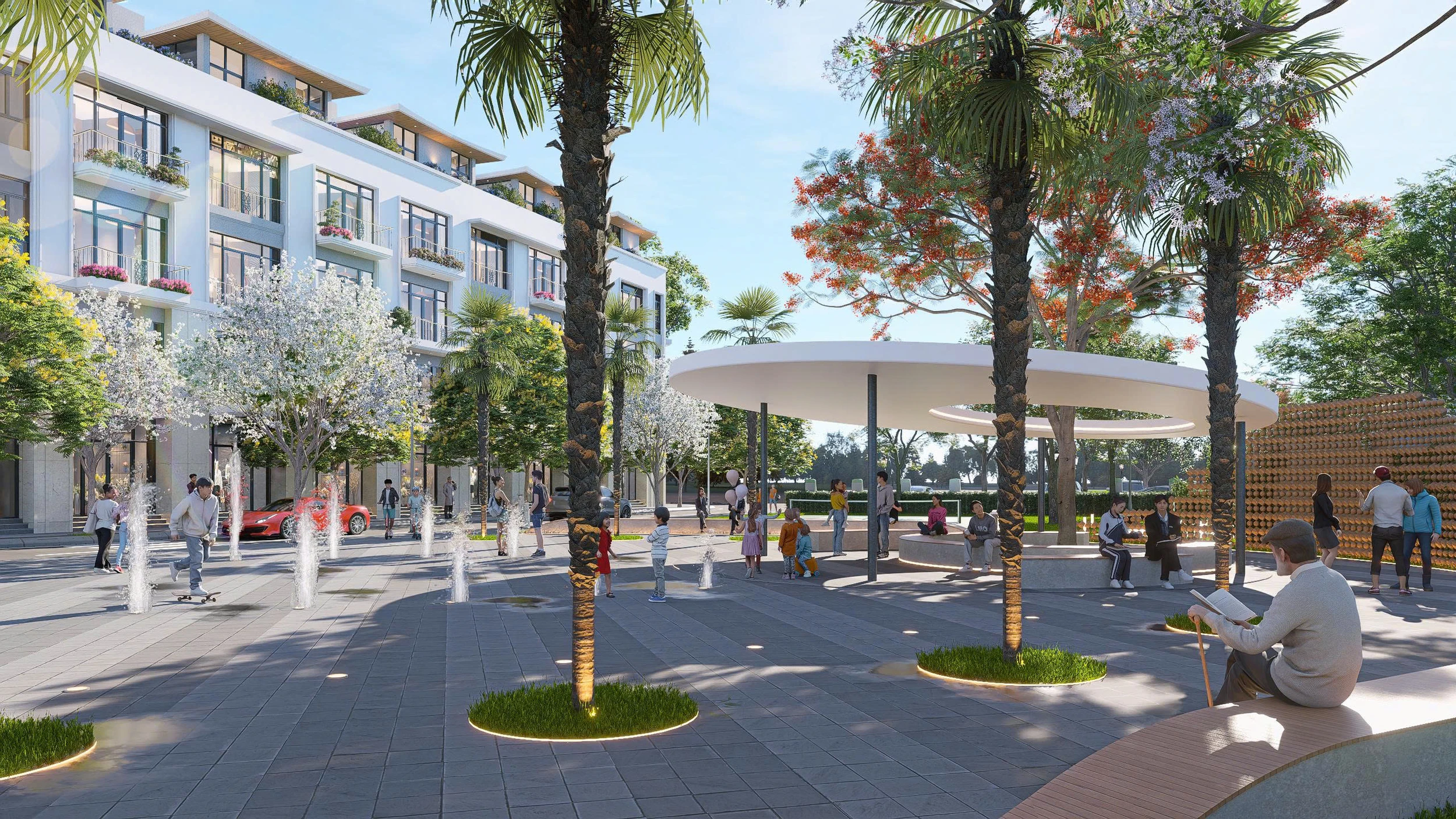 Phố đi bộ: Hệ thống lối dạo bộ rợp bóng cây xanh kết nối trực tiếp các dãy Shophouse sầm uất.